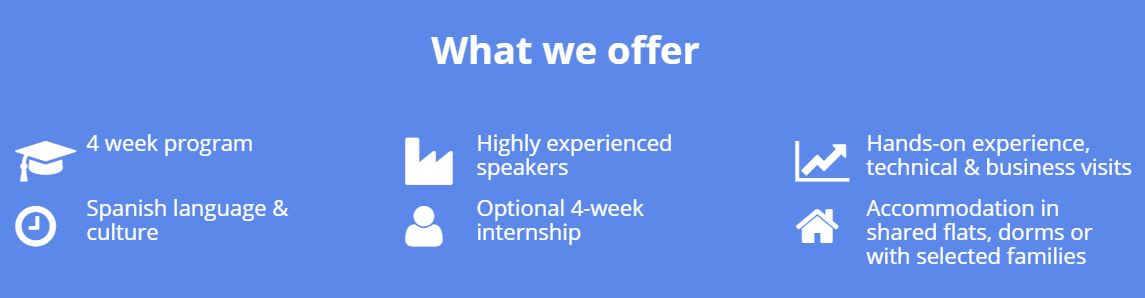 MABSの夏のプログラムは、欧州連合(EU)だけでなく、スペインの料理と文化の豊かさに焦点を当てた地中海アグリビジネス環境を学生に紹介しますと、スペイン語のレッスンが含まれます。 これは、主地中海バリューチェーンの - ワイン、オリーブオイル、果物や野菜、研究スペインのいくつかの都市への旅行だけでなく、成功した農産食品会社への訪問やでの活動としてseafood-レビュー多様共同カリキュラムプログラムですサラゴサの周り。 この留学プログラムは、スペインの企業でインターンシップを行うために余分月滞在の可能性と4週間持続します。